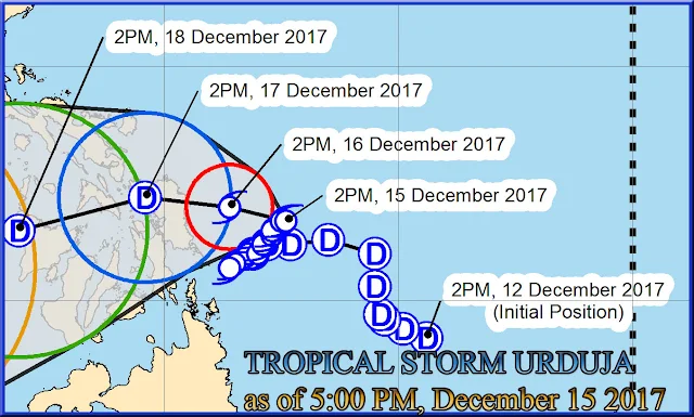 As of 5:00 PM today, 15 December 2017 - TS "URDUJA" REMAINS QUASI- STATIONARY AND CONTINUE PUTTING EASTERN VISAYAS AREA IN SERIOUS DANGER.