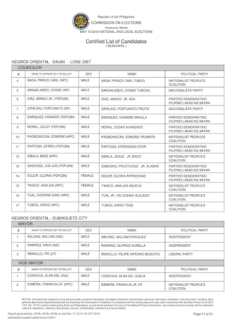Tentative List of Candidates for Local Positions: NEGROS ORIENTAL.